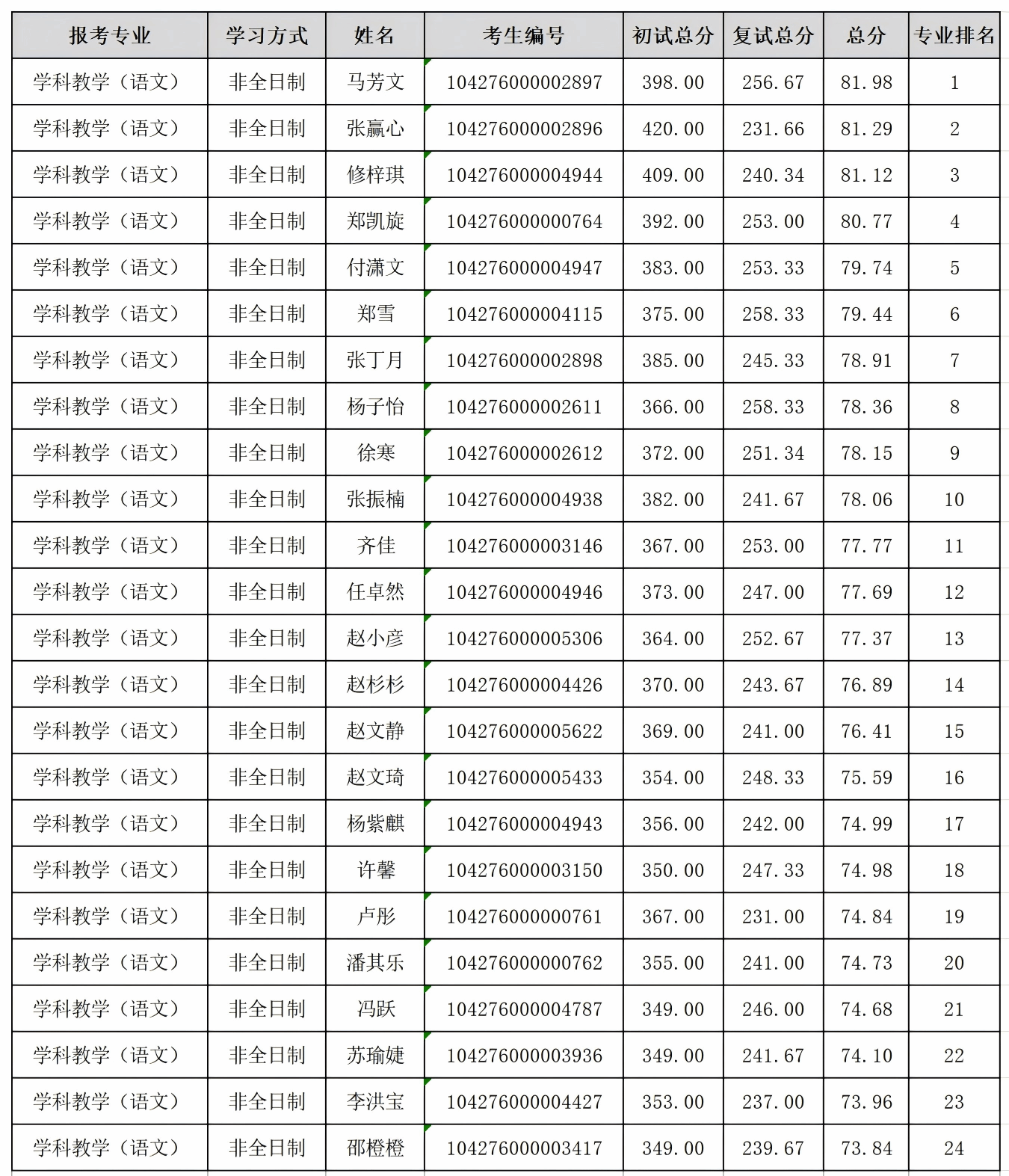 现将(050100)中国语言文学、(045103)学科教学(语文)、(055200)新闻与传播、(055300)出版硕士研究生一志愿批次考生成绩予以公示。