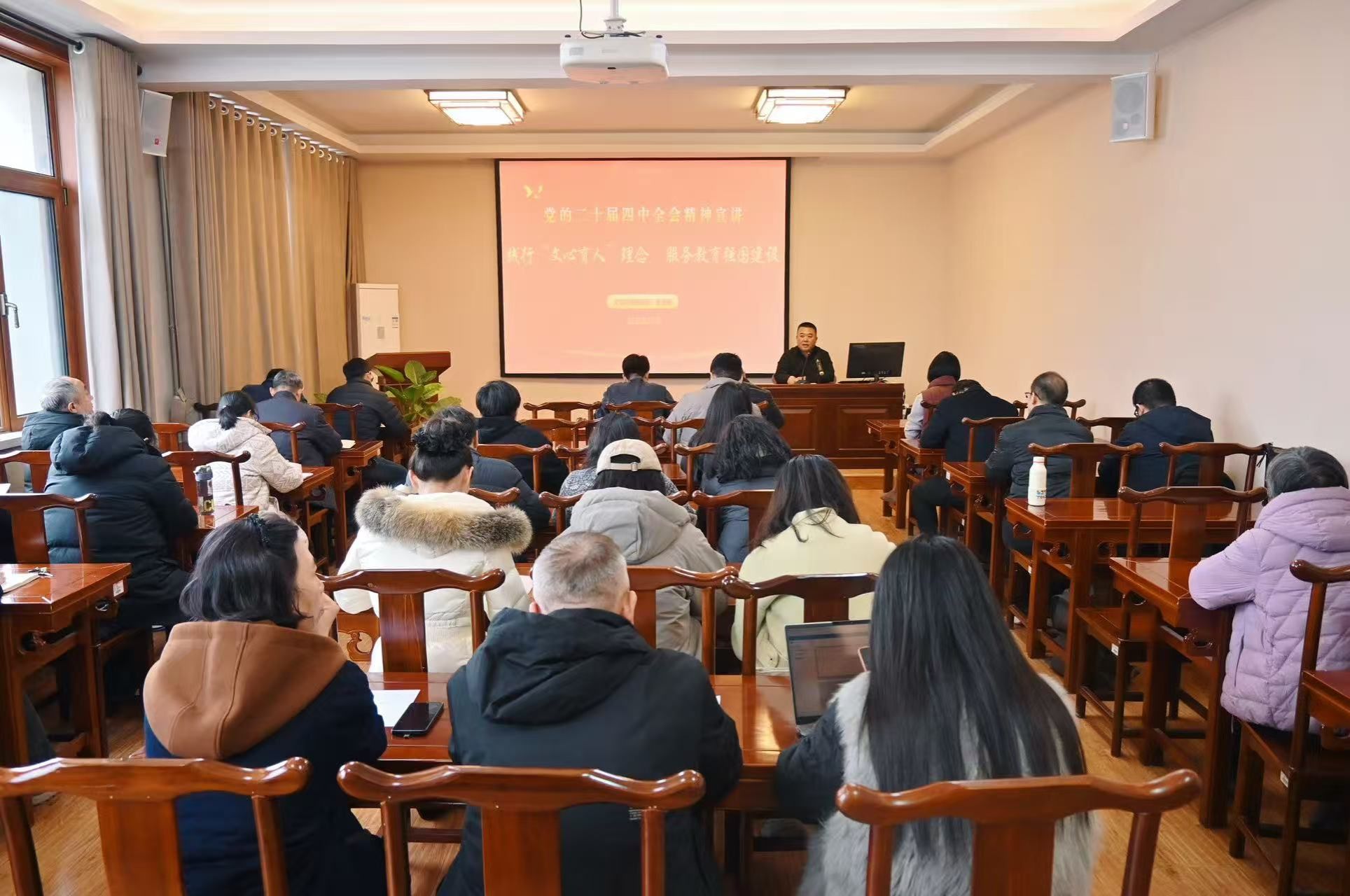 为深入学习贯彻党的二十届四中全会精神,凝聚思想共识,明确使命担当,12月23日,银河娱乐官网 党委在三教舜耕书院开展学习贯彻党的二十届四中全会精神宣讲。银河娱乐官网 党委书记朱海龙以《践行“文心育人”理念 服务教育强国建设》为题讲授专题党课,学院全体教职工党员参加学习。