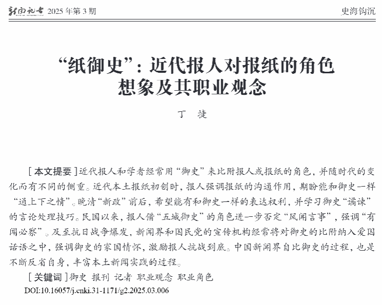 近日,我院丁捷副教授在《新闻记者》(CSSCI)2025年第3期上发表学术论文《“纸御史”:近代报人对报纸的角色想象及其职业观念》。该论文为2021年度国家社科基金一般项目“晚清新式官报史料整理与研究”(项目批准号:21BXW026)的阶段性成果。