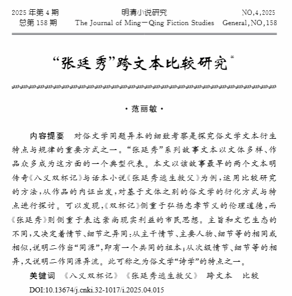 近日,我院范丽敏教授在《明清小说研究》(CSSCI)2025年第4期上发表学术论文《“张廷秀”跨文本比较研究》。该论文系国家社会科学基金一般项目“明成化刊本说唱词话跨文本文献整理与研究”(20BZW065)的重要阶段性成果。
